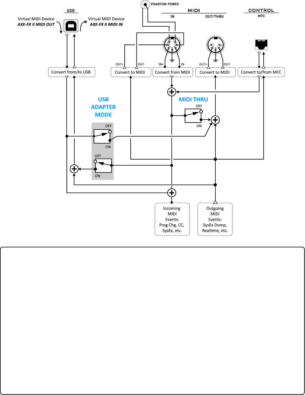 b. Incoming data at the MIDI IN port or the MFC port of the Axe-Fx II is forwarded
