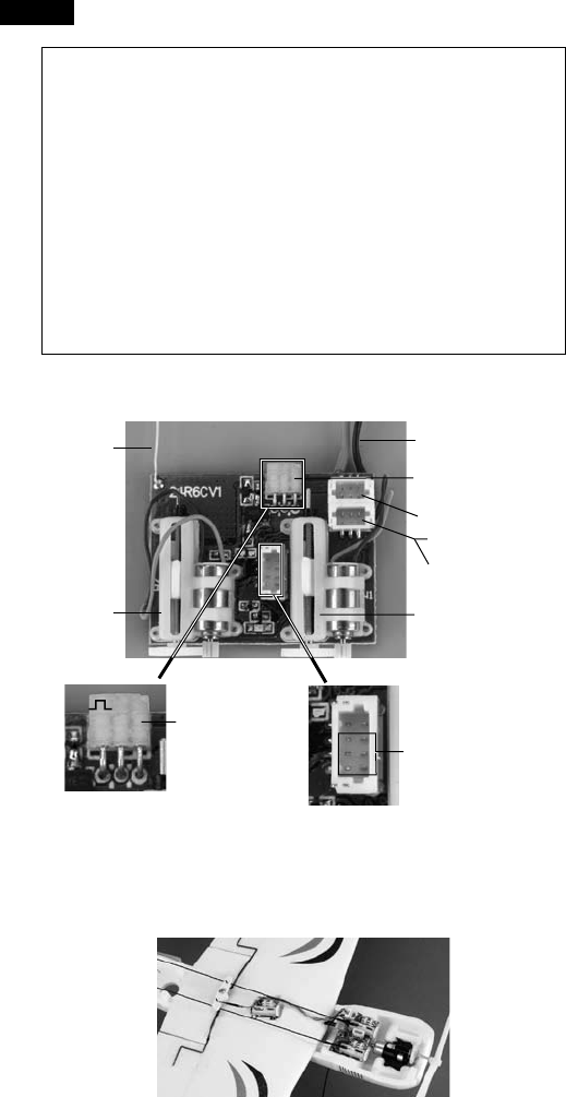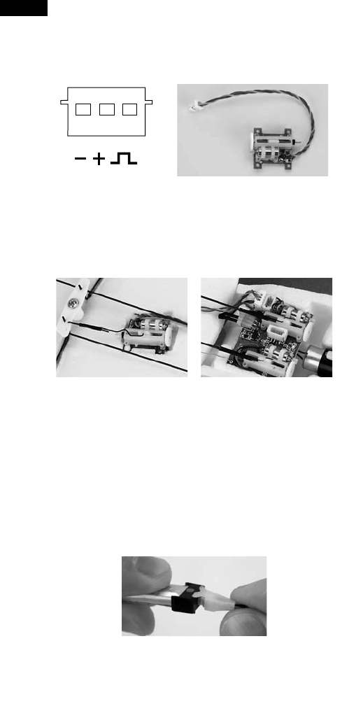 servo leads into the appropriate servo ports in the receiver noting the polarity of the servo connector.