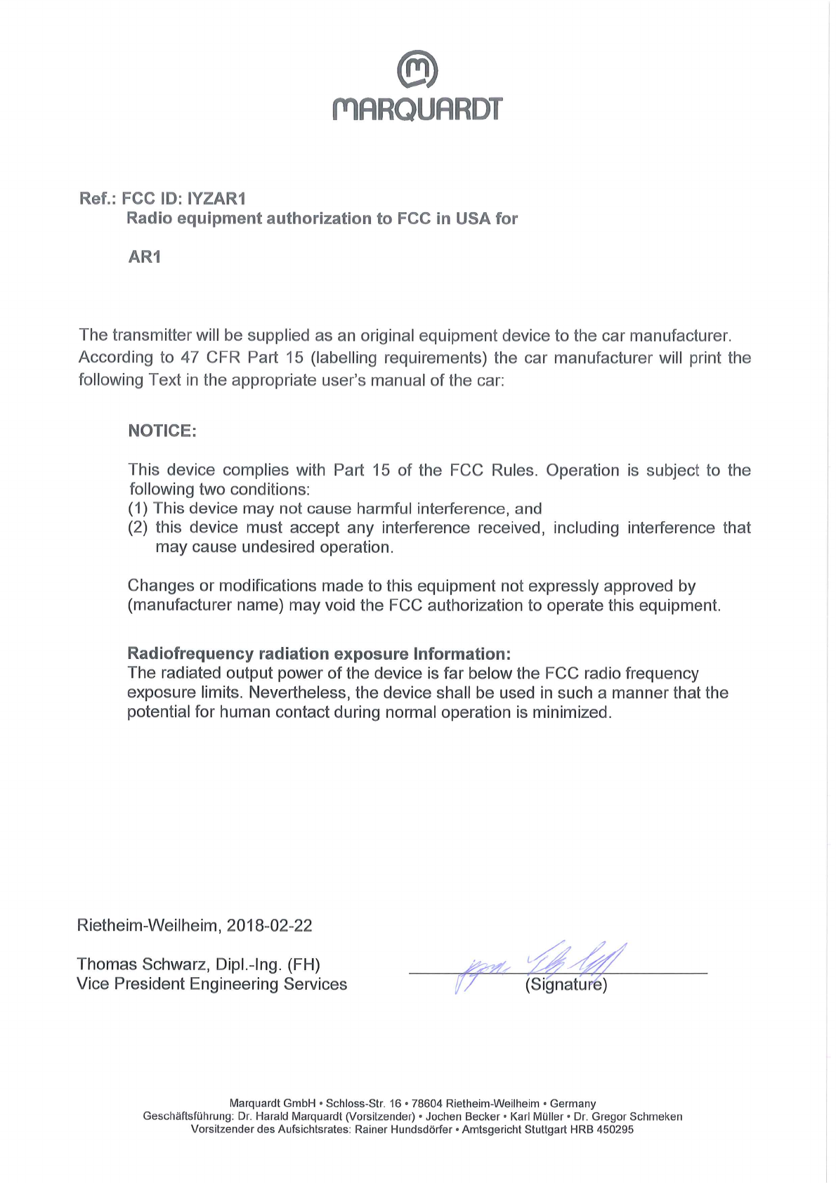 Marquardt GmbH Audi NFC center console reader Regulatory Declarations