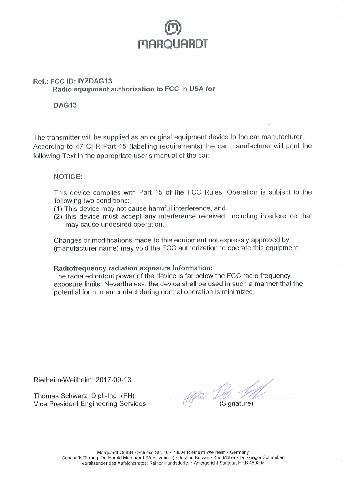 Marquardt DAG13 Car Key User Manual FCC declaration user manual