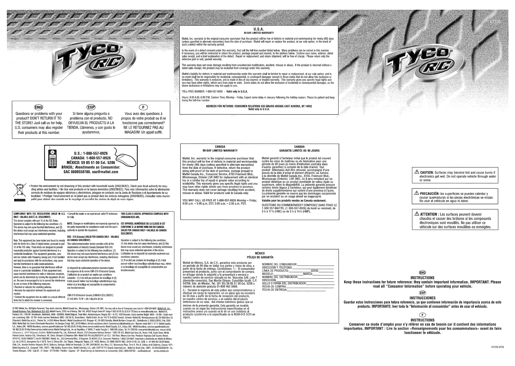 Mattel Asia Pacific Sourcing K7220-07A2T RC Car User Manual