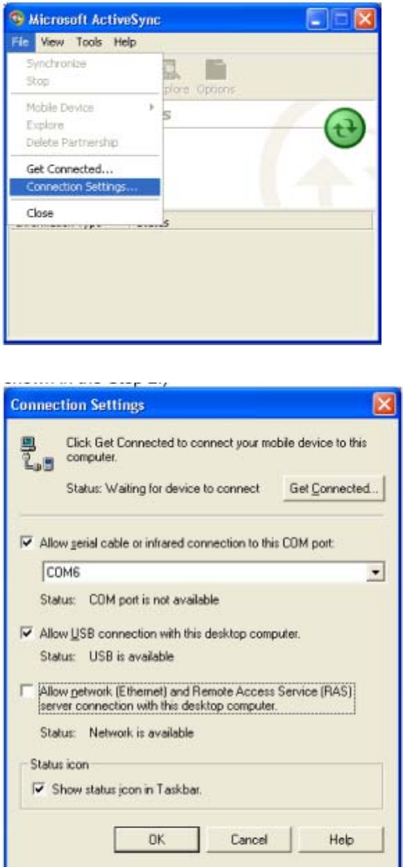 3.In the Microsoft ActiveSync window, select Connection Settings... from drop-down list of File