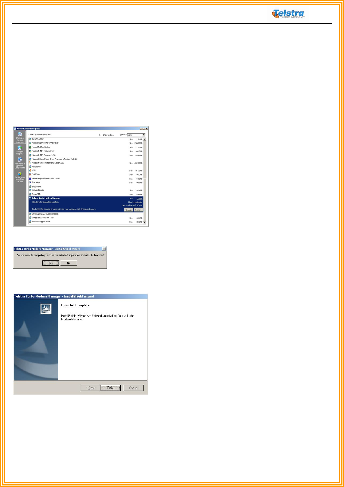 Under Add/Remove programs in Control Panel, select Telstra Turbo Modem™ Manager and click “Remove”.