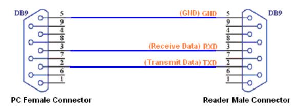 RS232 of reader to the COM port of PC with DB9 Female cable. The inner connecting relationship is