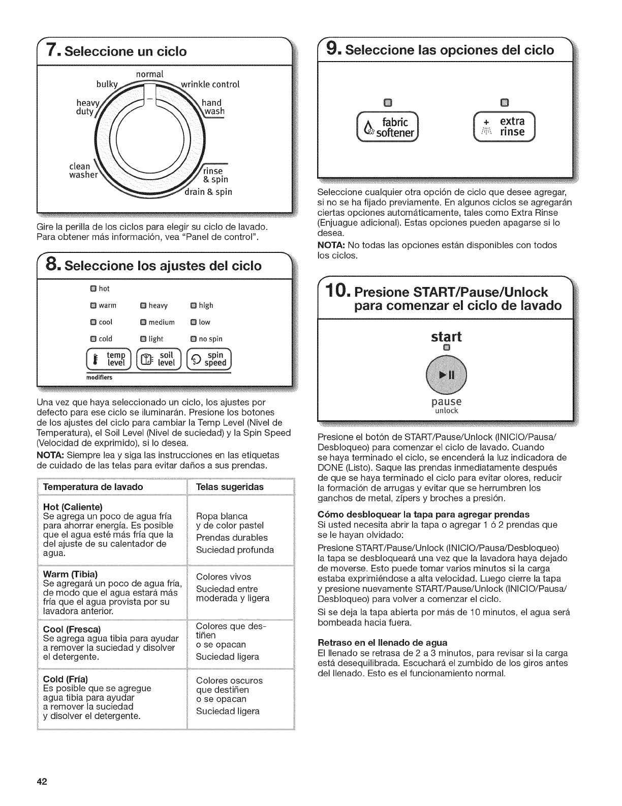 de START/Pause/Unlock tomar varios minutos si se estan lavando cargas grandes o telas pesadas.