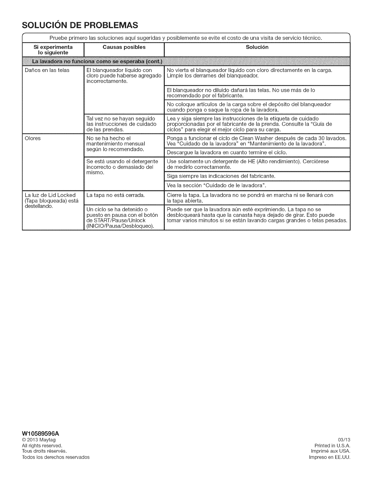 La luz de Lid Locked La tapa no esta cerrada. Cierre la tapa. La lavadora no se pondra en marcha ni se Ilenara con