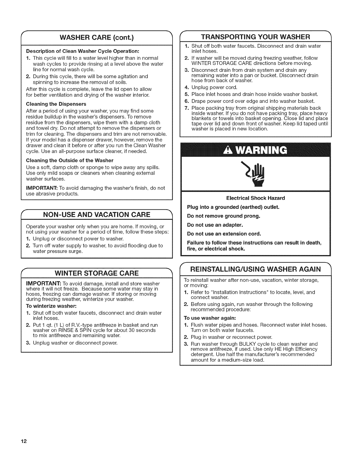 WARNING: To reduce the risk of fire, electric shock, or injury to persons when using the washer, follow basic precautions,