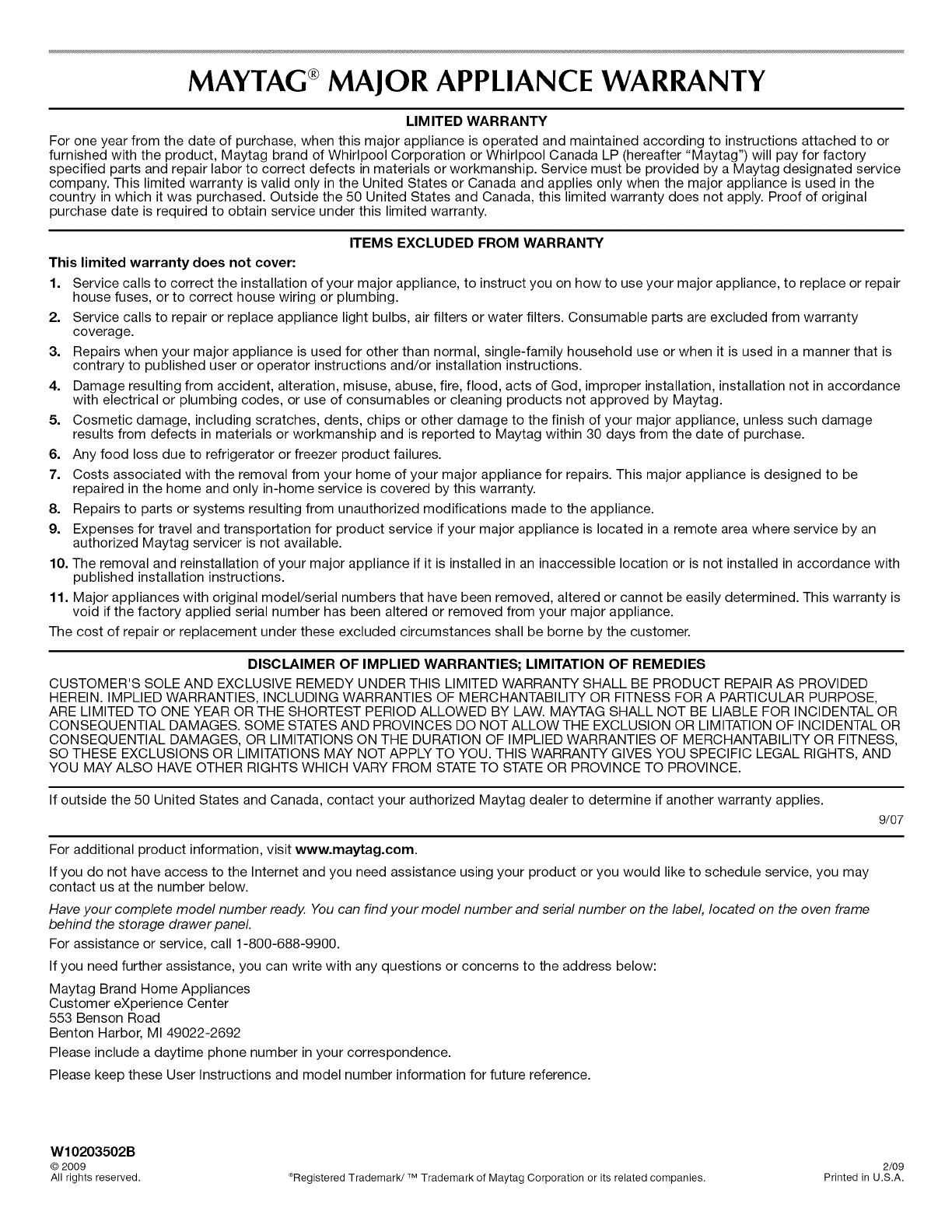 MAYTAG ®MAJOR APPLIANCE WARRANTY
