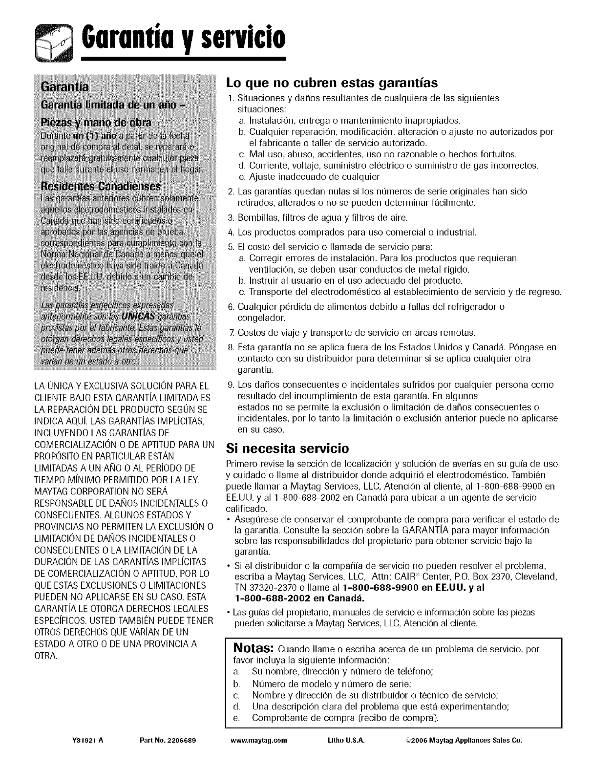 Y81921 A Part No. 2206689 www.maytag.com Litho U.S.A. :_2006 Maytag Appliances Sales Co.