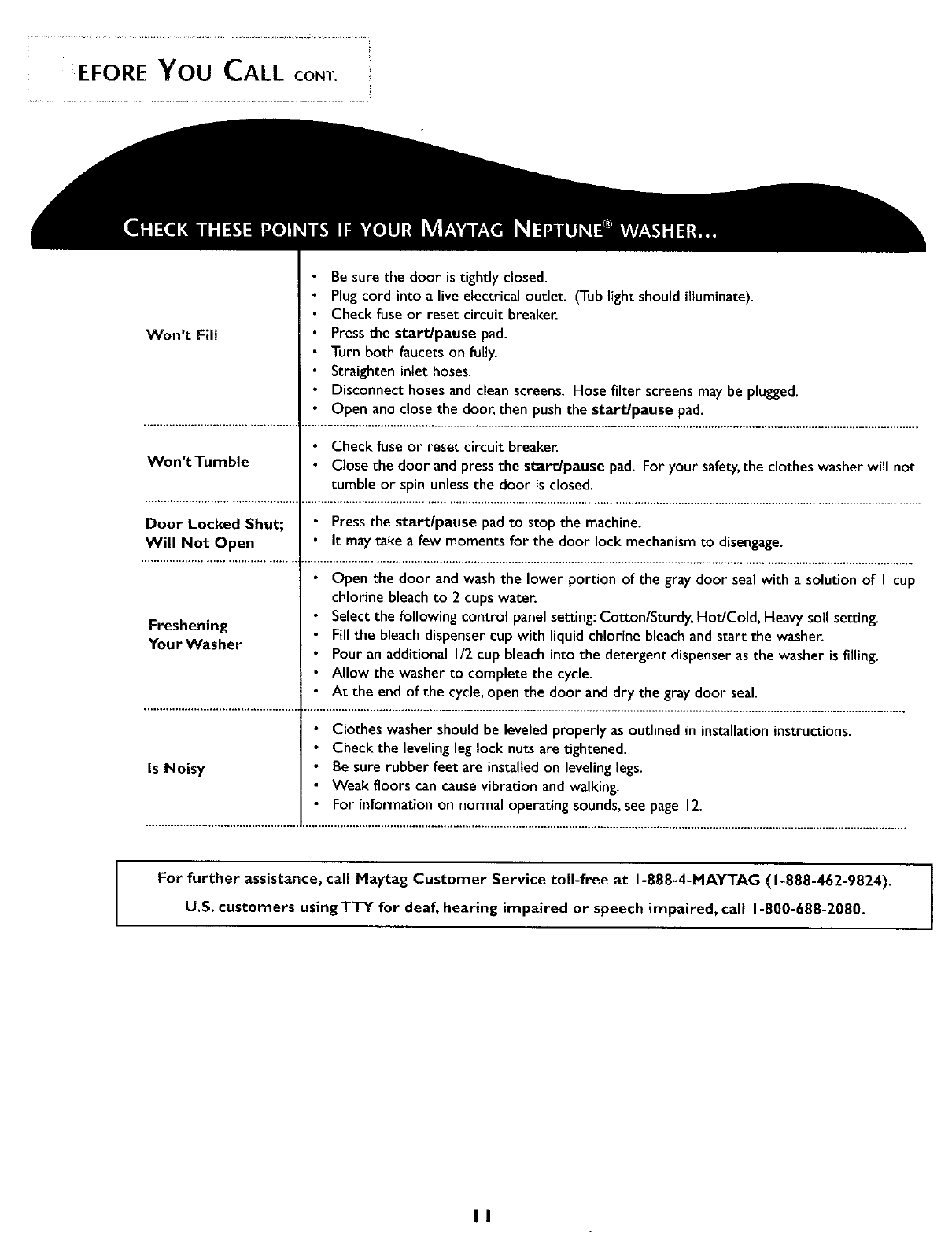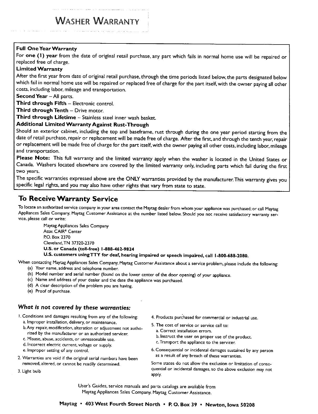 Appliances SalesCompany, MaytagCustomer Assistance at the number listed below. Should you not receive satisfactory warranty ser-
