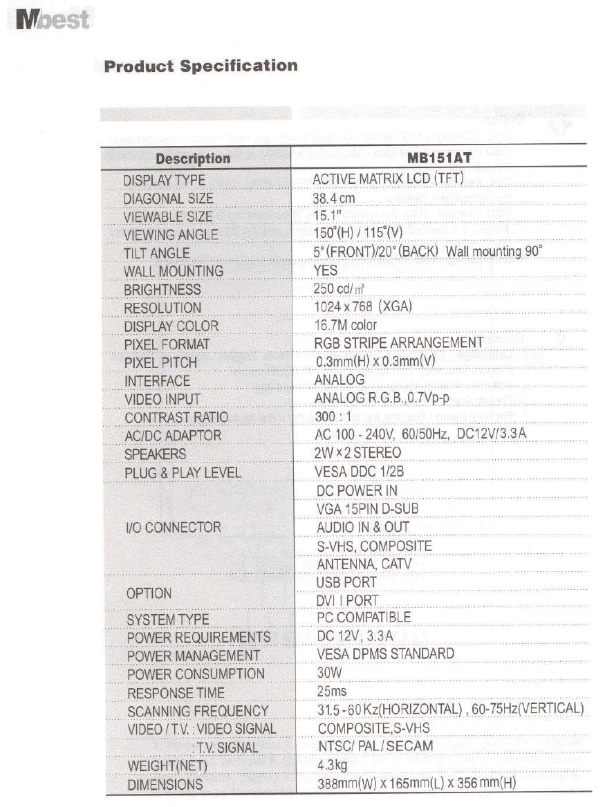 Mbestek MB151AT TFT LCD Monitor W/TV Tuner User Manual QRHMB151AT manual
