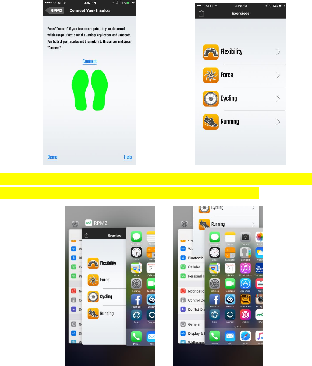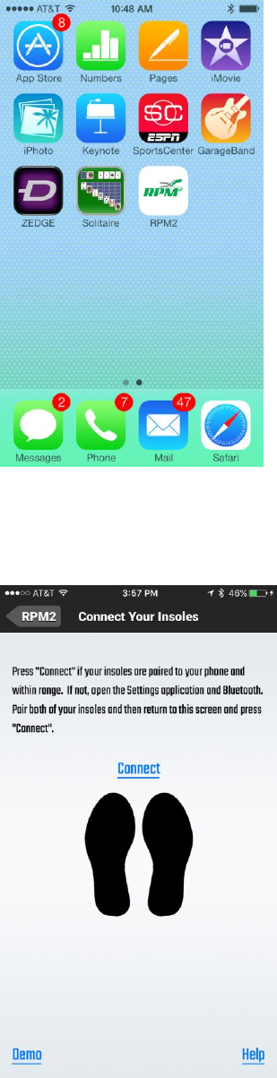 Step 3. Tap “Connect”. Feet should turn Green. If Connection is Successful, app moves to Main Menu Screen.