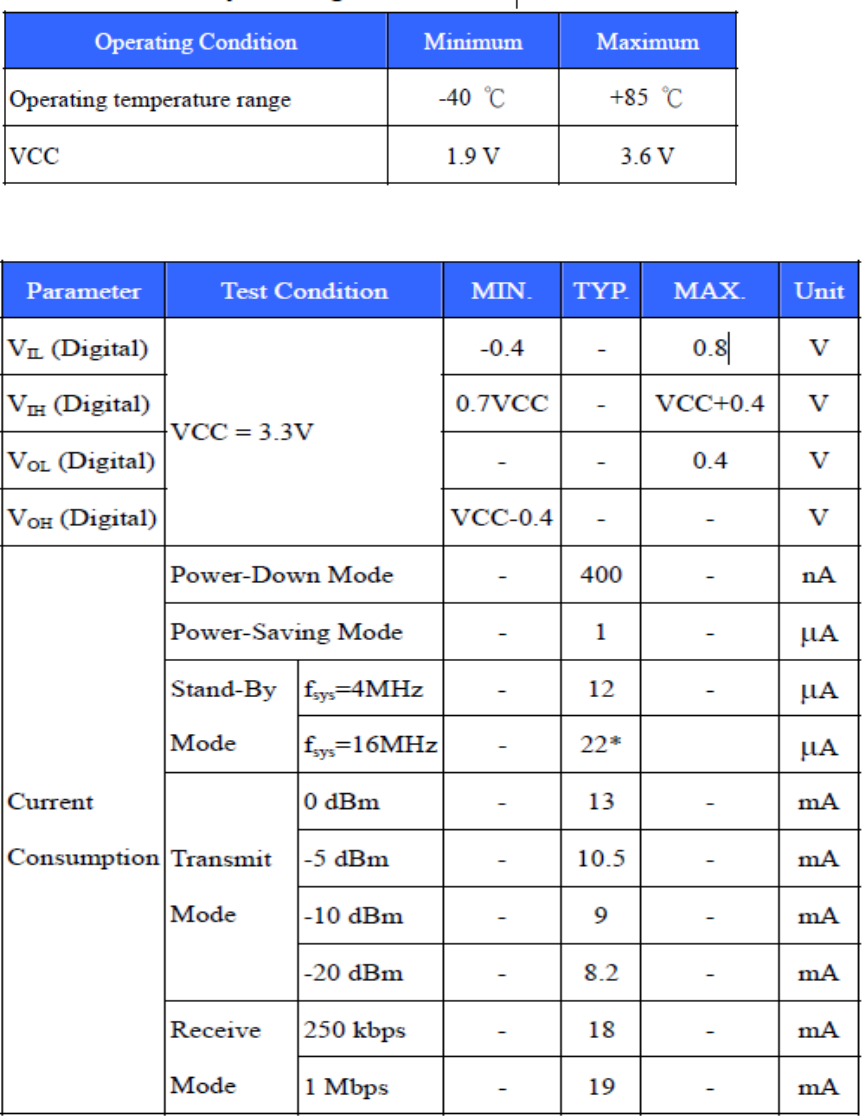 - Low current consumption, 8.2mA@-20dBm at TX mode and 18mA at RX mode