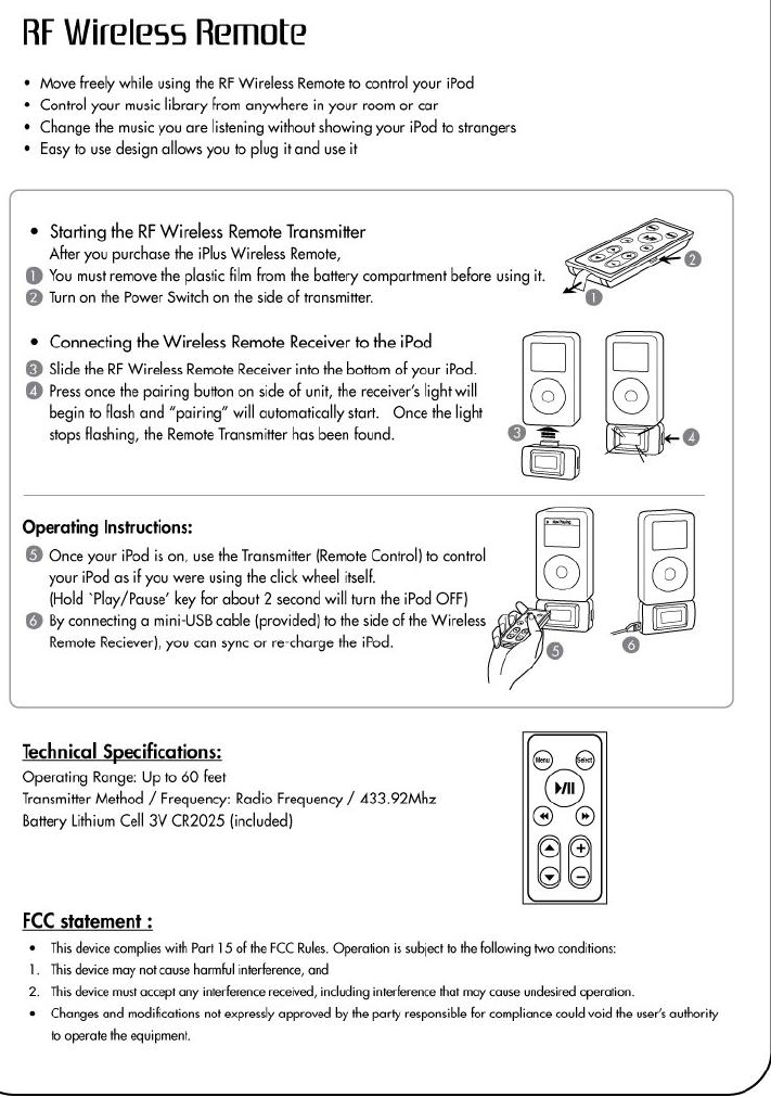Micro Electronics RF433 RF Remote Control For iPod User Manual