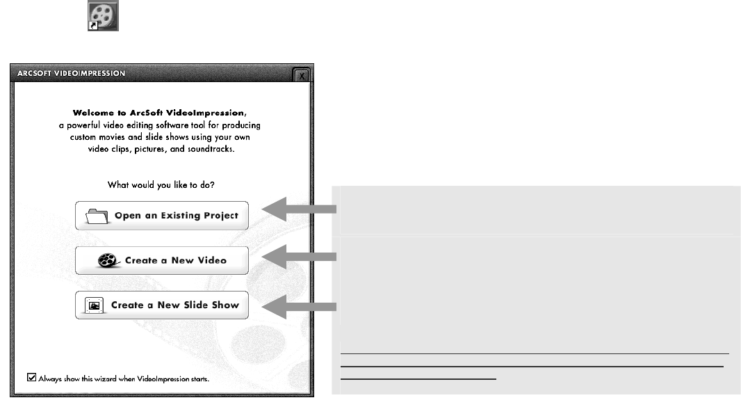 Click this Icon on your desktop or click Start Æ ProgramsÆ Arcsoft Videoimpression. Once the applications is opened,