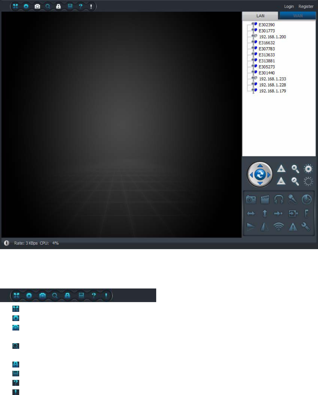 Thereareeightbuttonsintheupperleftcornerofthesoftware,fromlefttoright:fullscreen,Setting,setthecamera