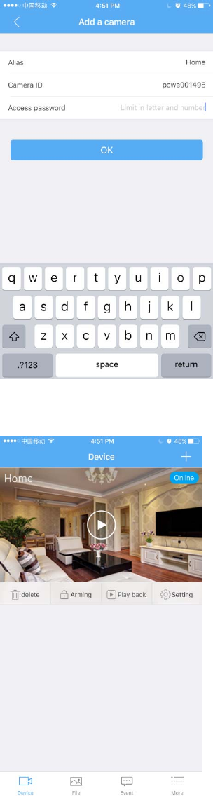 3.Enter Alias and enter access password,you can find the password on the back of device,the name is Acces code
