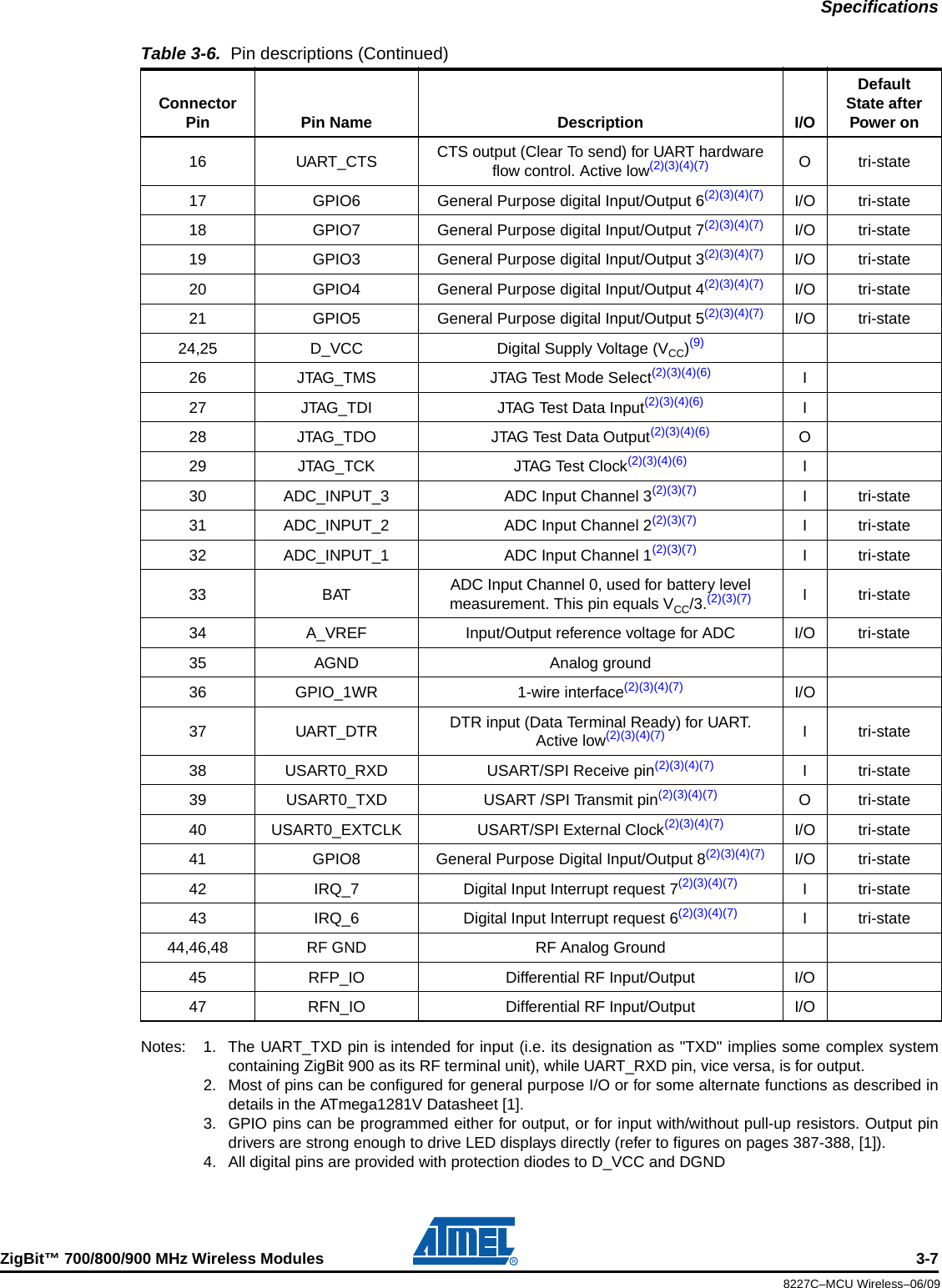 SpecificationsZigBit™ 700/800/900 MHz Wireless Modules 3-78227C–MCU Wireless–06/09Notes: 1. The UART_TXD pin is intended for input (i.e. its designation as "TXD" implies some complex systemcontaining ZigBit 900 as its RF terminal unit), while UART_RXD pin, vice versa, is for output.2. Most of pins can be configured for general purpose I/O or for some alternate functions as described indetails in the ATmega1281V Datasheet [1].3. GPIO pins can be programmed either for output, or for input with/without pull-up resistors. Output pindrivers are strong enough to drive LED displays directly (refer to figures on pages 387-388, [1]).4. All digital pins are provided with protection diodes to D_VCC and DGND16 UART_CTS CTS output (Clear To send) for UART hardware flow control. Active low(2)(3)(4)(7) O tri-state17 GPIO6 General Purpose digital Input/Output 6(2)(3)(4)(7) I/O tri-state18 GPIO7 General Purpose digital Input/Output 7(2)(3)(4)(7) I/O tri-state19 GPIO3 General Purpose digital Input/Output 3(2)(3)(4)(7) I/O tri-state20 GPIO4 General Purpose digital Input/Output 4(2)(3)(4)(7) I/O tri-state21 GPIO5 General Purpose digital Input/Output 5(2)(3)(4)(7) I/O tri-state24,25 D_VCC Digital Supply Voltage (VCC)(9)26 JTAG_TMS JTAG Test Mode Select(2)(3)(4)(6) I27 JTAG_TDI JTAG Test Data Input(2)(3)(4)(6) I28 JTAG_TDO JTAG Test Data Output(2)(3)(4)(6) O29 JTAG_TCK JTAG Test Clock(2)(3)(4)(6) I30 ADC_INPUT_3 ADC Input Channel 3(2)(3)(7) I tri-state31 ADC_INPUT_2 ADC Input Channel 2(2)(3)(7) I tri-state32 ADC_INPUT_1 ADC Input Channel 1(2)(3)(7) I tri-state33 BAT ADC Input Channel 0, used for battery level measurement. This pin equals VCC/3.(2)(3)(7) I tri-state34 A_VREF Input/Output reference voltage for ADC I/O tri-state35 AGND Analog ground36 GPIO_1WR 1-wire interface(2)(3)(4)(7) I/O37 UART_DTR DTR input (Data Terminal Ready) for UART. Active low(2)(3)(4)(7) I tri-state38 USART0_RXD USART/SPI Receive pin(2)(3)(4)(7) I tri-state39 USART0_TXD USART /SPI Transmit pin(2)(3)(4)(7) O tri-state40 USART0_EXTCLK USART/SPI External Clock(2)(3)(4)(7) I/O tri-state41 GPIO8 General Purpose Digital Input/Output 8(2)(3)(4)(7) I/O tri-state42 IRQ_7 Digital Input Interrupt request 7(2)(3)(4)(7) I tri-state43 IRQ_6 Digital Input Interrupt request 6(2)(3)(4)(7) I tri-state44,46,48 RF GND RF Analog Ground45 RFP_IO Differential RF Input/Output I/O47 RFN_IO Differential RF Input/Output I/OTable 3-6.  Pin descriptions (Continued)Connector Pin Pin Name Description I/ODefault State after Power on