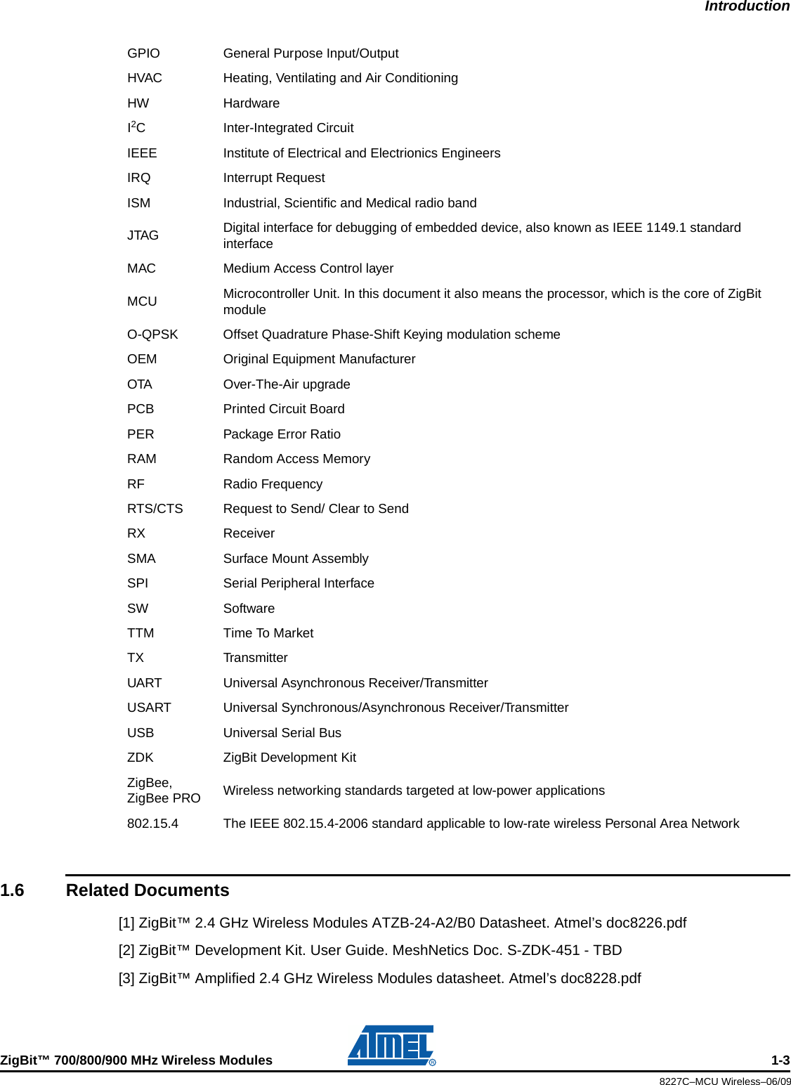 IntroductionZigBit™ 700/800/900 MHz Wireless Modules 1-38227C–MCU Wireless–06/091.6 Related Documents[1] ZigBit™ 2.4 GHz Wireless Modules ATZB-24-A2/B0 Datasheet. Atmel’s doc8226.pdf[2] ZigBit™ Development Kit. User Guide. MeshNetics Doc. S-ZDK-451 - TBD[3] ZigBit™ Amplified 2.4 GHz Wireless Modules datasheet. Atmel’s doc8228.pdfGPIO General Purpose Input/OutputHVAC Heating, Ventilating and Air ConditioningHW HardwareI2C Inter-Integrated CircuitIEEE Institute of Electrical and Electrionics EngineersIRQ Interrupt RequestISM Industrial, Scientific and Medical radio bandJTAG Digital interface for debugging of embedded device, also known as IEEE 1149.1 standard interfaceMAC Medium Access Control layerMCU Microcontroller Unit. In this document it also means the processor, which is the core of ZigBit moduleO-QPSK Offset Quadrature Phase-Shift Keying modulation schemeOEM Original Equipment ManufacturerOTA Over-The-Air upgradePCB Printed Circuit BoardPER Package Error RatioRAM Random Access MemoryRF Radio FrequencyRTS/CTS Request to Send/ Clear to SendRX ReceiverSMA Surface Mount AssemblySPI Serial Peripheral InterfaceSW SoftwareTTM Time To MarketTX TransmitterUART Universal Asynchronous Receiver/TransmitterUSART Universal Synchronous/Asynchronous Receiver/TransmitterUSB Universal Serial BusZDK ZigBit Development KitZigBee, ZigBee PRO Wireless networking standards targeted at low-power applications802.15.4 The IEEE 802.15.4-2006 standard applicable to low-rate wireless Personal Area Network