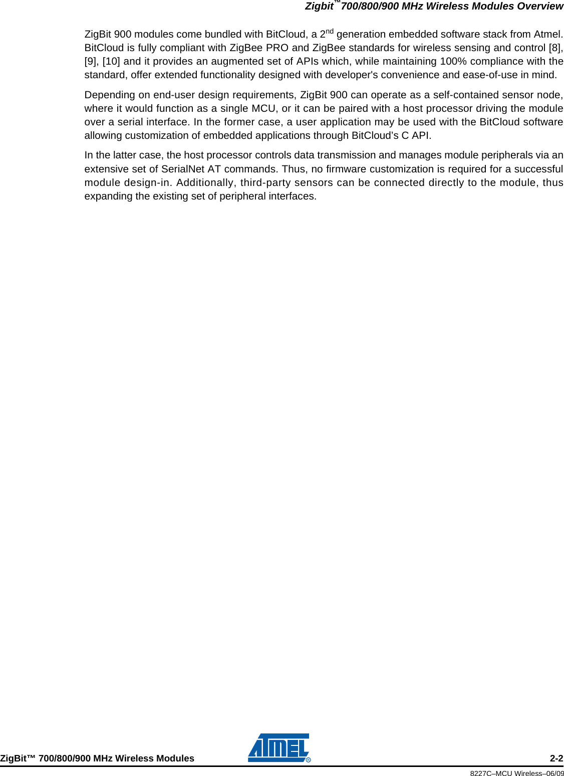 Zigbit™700/800/900 MHz Wireless Modules OverviewZigBit™ 700/800/900 MHz Wireless Modules 2-28227C–MCU Wireless–06/09ZigBit 900 modules come bundled with BitCloud, a 2nd generation embedded software stack from Atmel.BitCloud is fully compliant with ZigBee PRO and ZigBee standards for wireless sensing and control [8],[9], [10] and it provides an augmented set of APIs which, while maintaining 100% compliance with thestandard, offer extended functionality designed with developer's convenience and ease-of-use in mind.Depending on end-user design requirements, ZigBit 900 can operate as a self-contained sensor node,where it would function as a single MCU, or it can be paired with a host processor driving the moduleover a serial interface. In the former case, a user application may be used with the BitCloud softwareallowing customization of embedded applications through BitCloud’s C API.In the latter case, the host processor controls data transmission and manages module peripherals via anextensive set of SerialNet AT commands. Thus, no firmware customization is required for a successfulmodule design-in. Additionally, third-party sensors can be connected directly to the module, thusexpanding the existing set of peripheral interfaces.