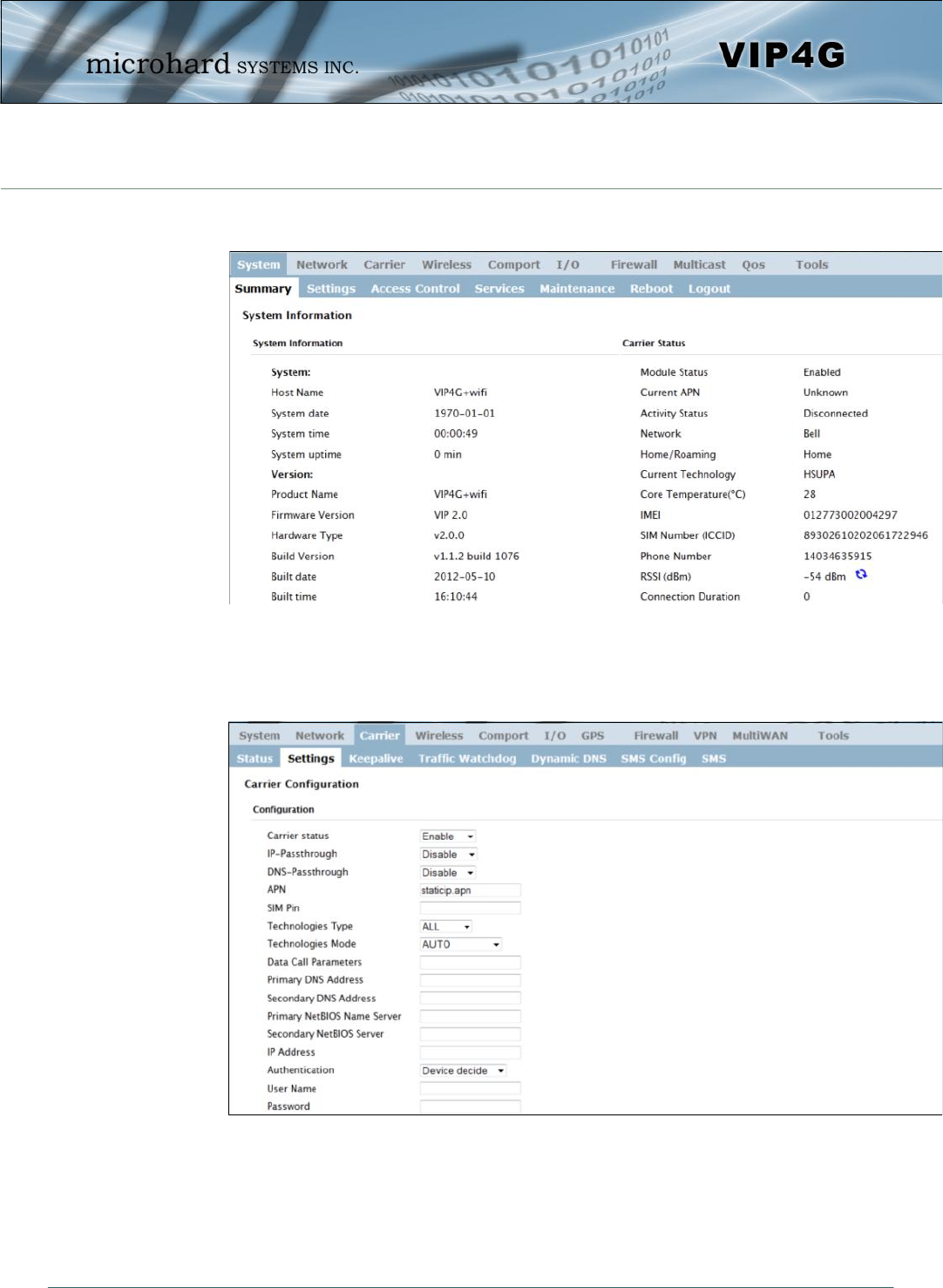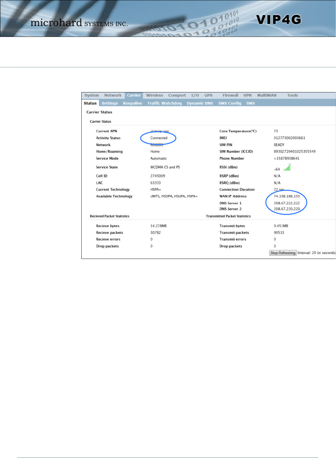 On the Carrier > Status Tab, verify that a WAN IP Address has been assigned by