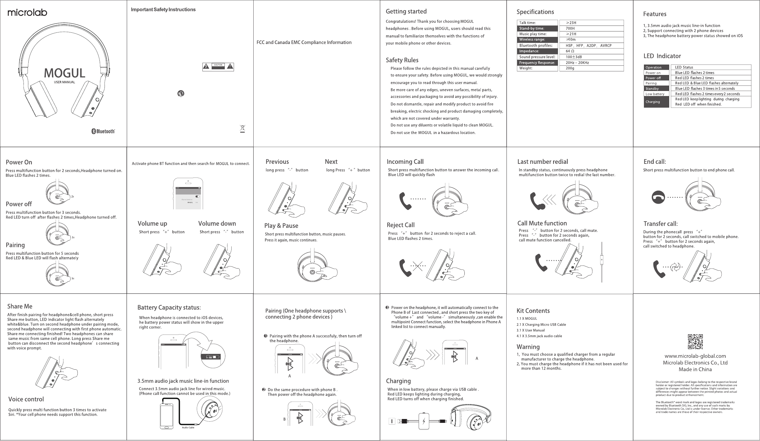 Microlab Electronics MOGUL On-ear Bluetooth Stero Headphone User Manual 80 Mogul 97 0001 US 01