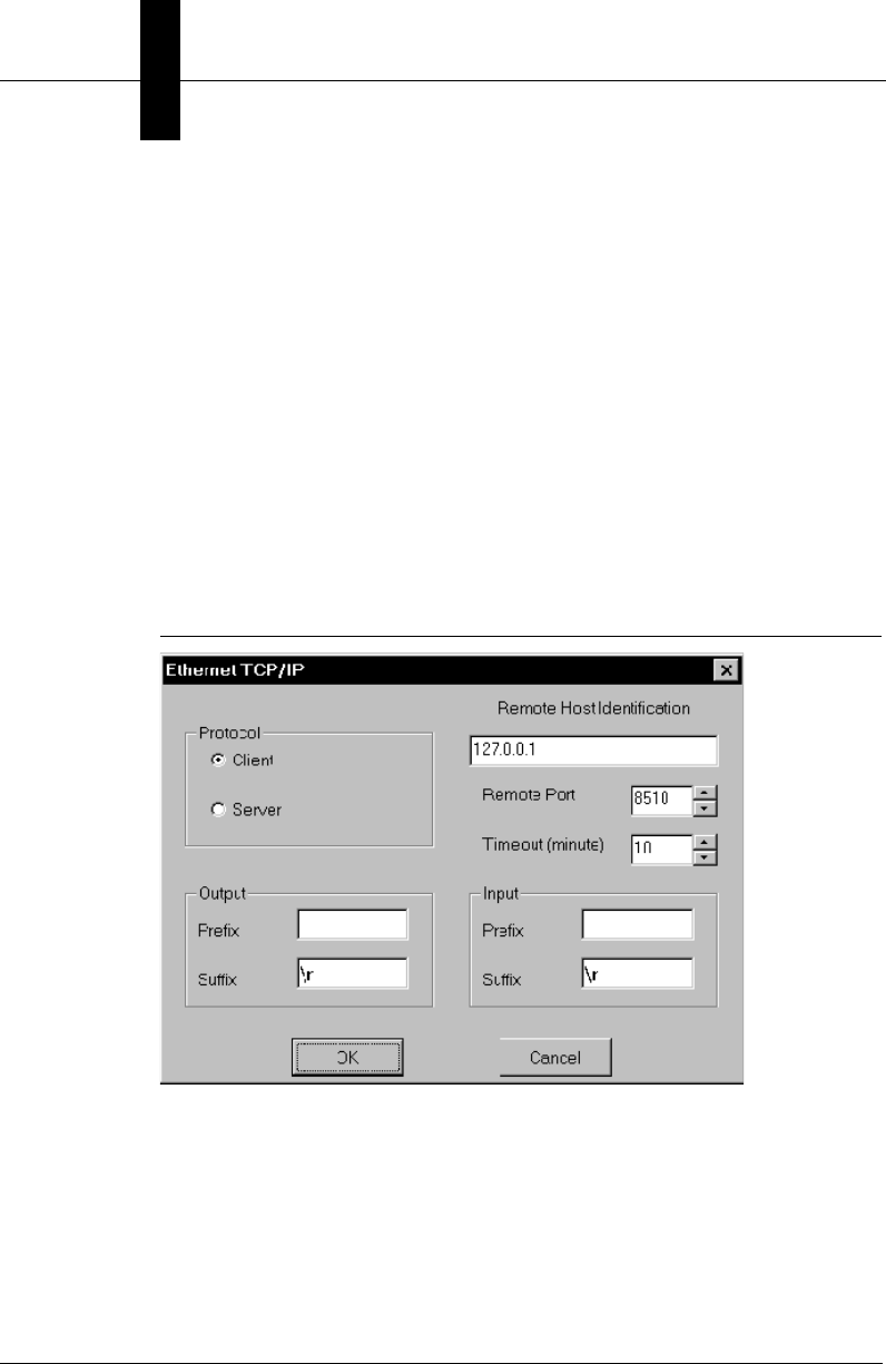 - TCPIP {host ID, port number} [, in prefix, in suffix, out prefix, out suffix]