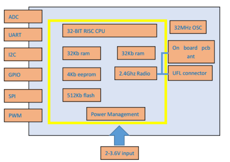 The JN5169 features 512 kB embedded Flash, 32 kB RAM and 4 kB