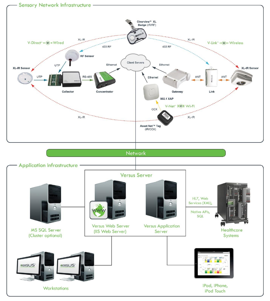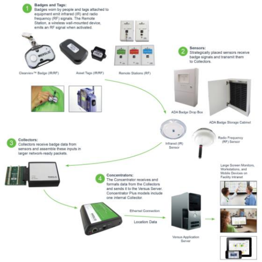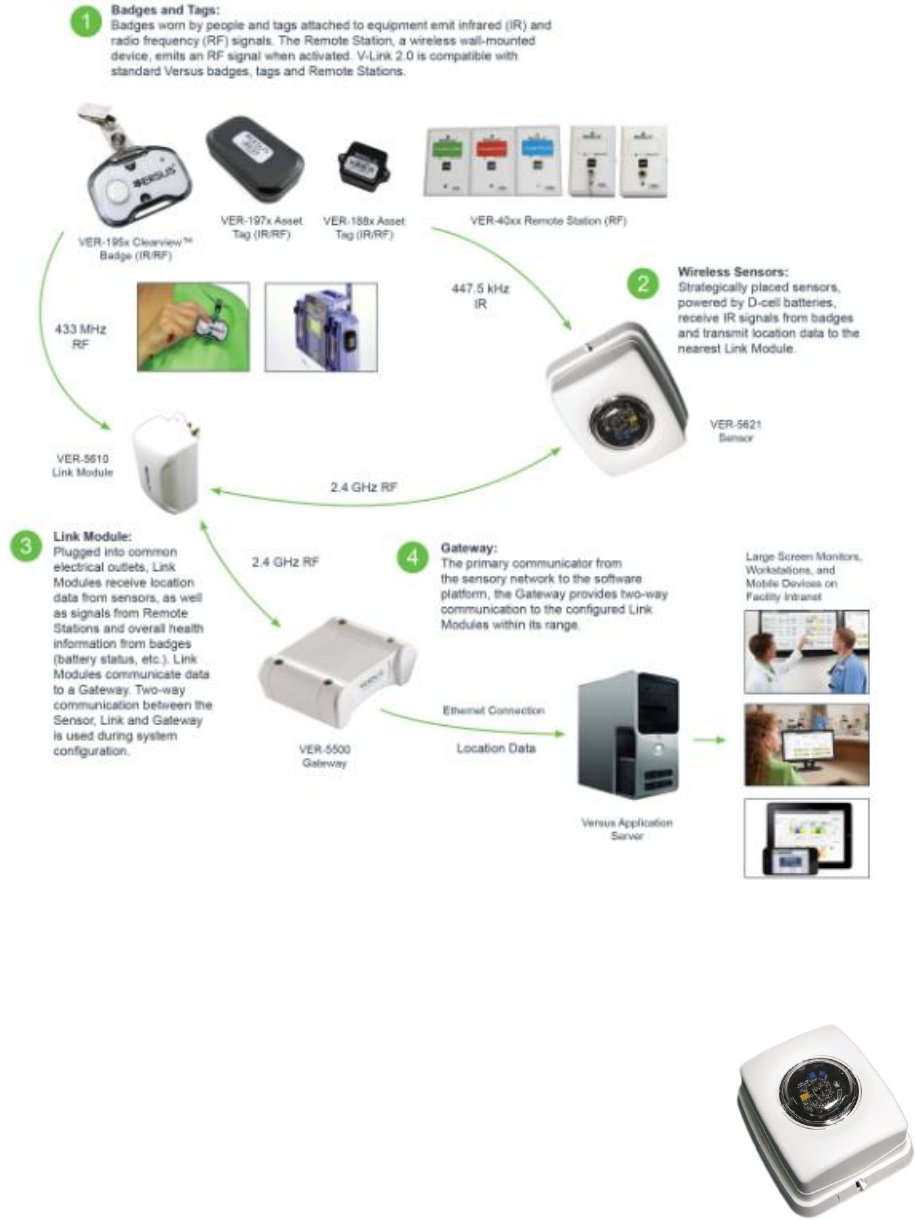 frequency (RF) wireless protocol, then aggregates location data before sending it via Ethernet to Versus