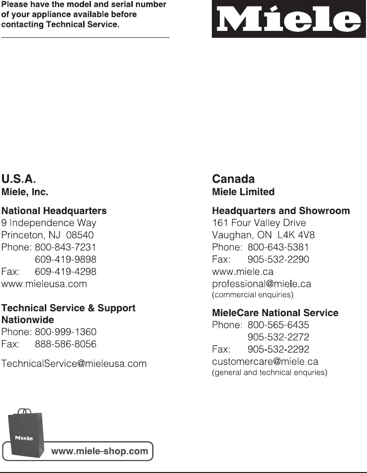 161, Four Valley Drive Adresse électronique : customercare@miele.ca