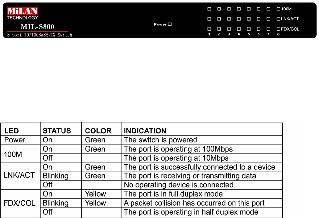 • LED indicators for power, link speed 100Mbps, link and activity, full duplex and collision