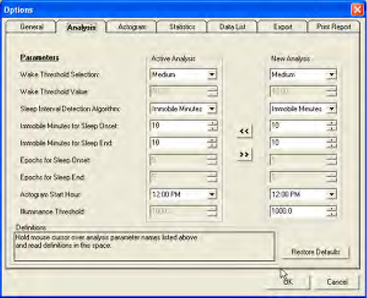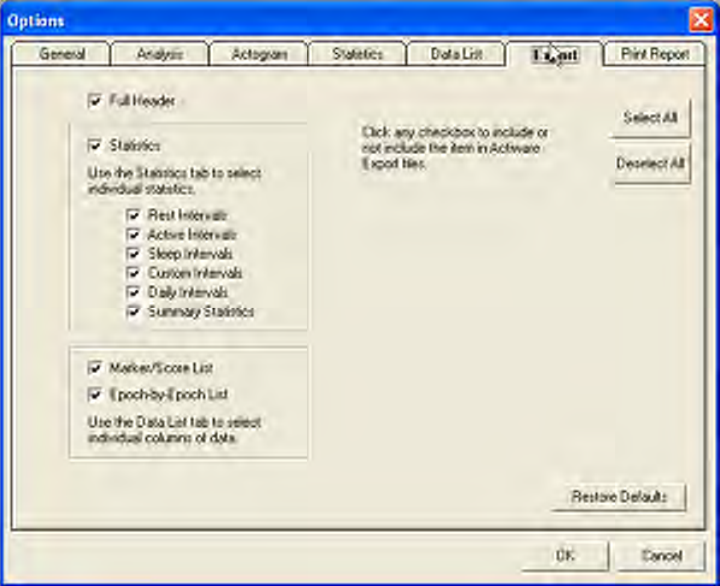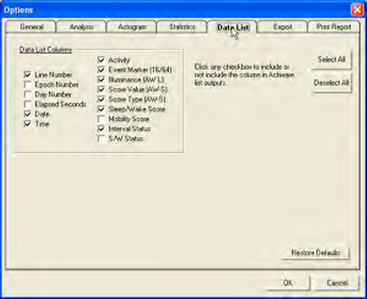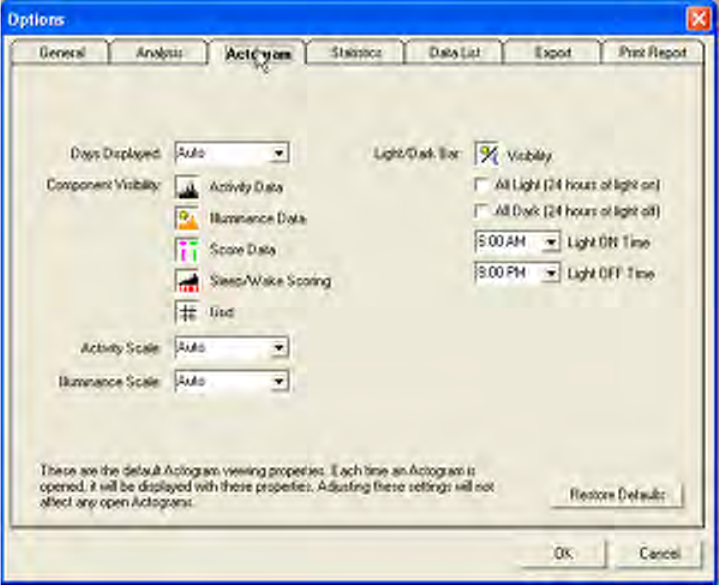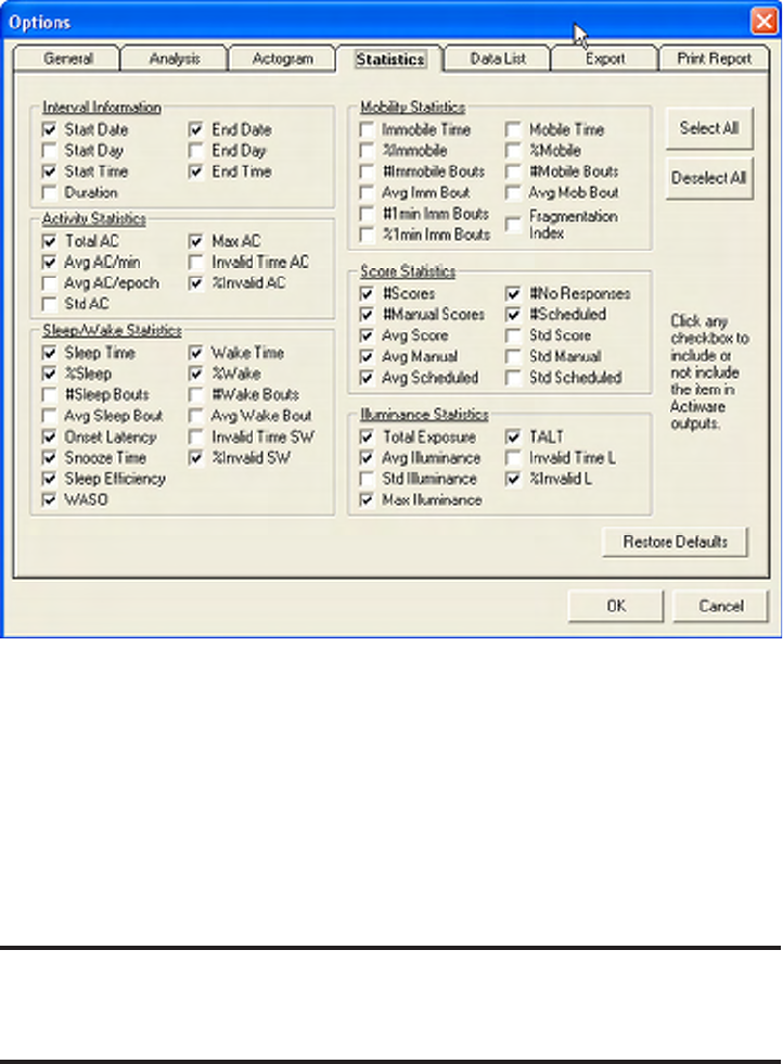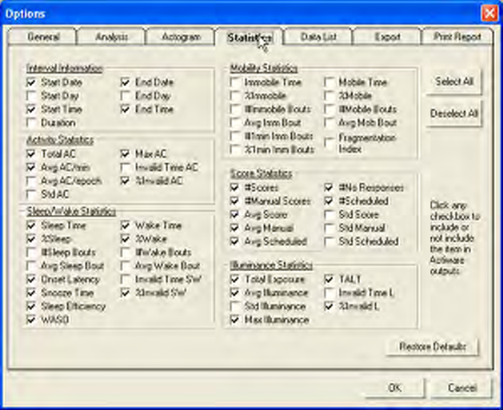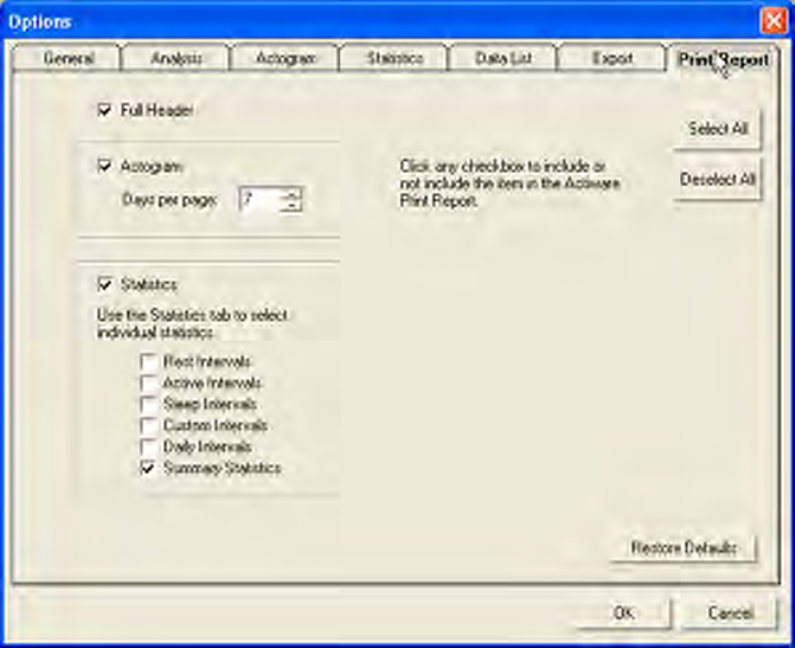 the number of Actogram days to print per page. Click the Statistics box (and sub-