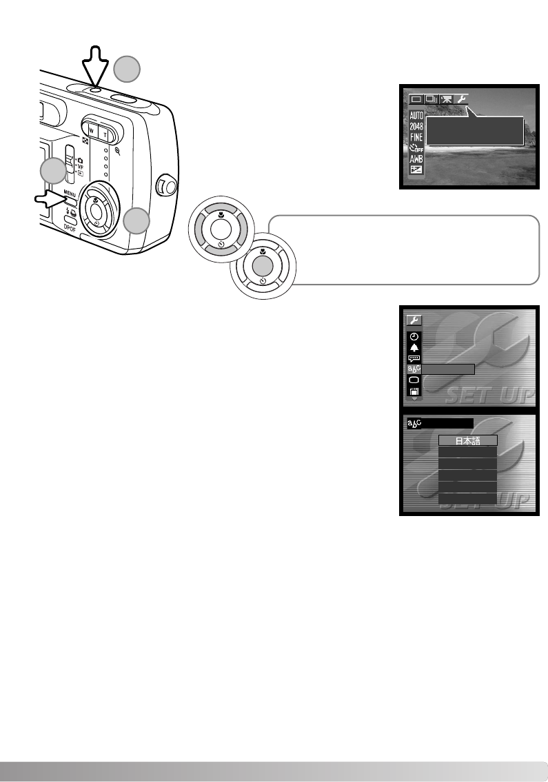 Menu languages: Japanese, English, German, French, Spanish, and