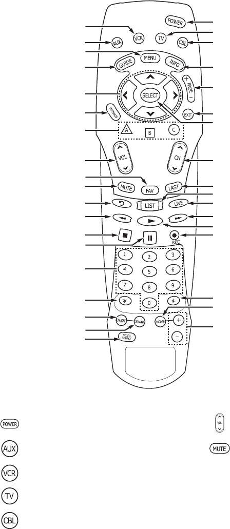 across the top of the remote. These keys, known as mode keys, are labeled CBL, TV,