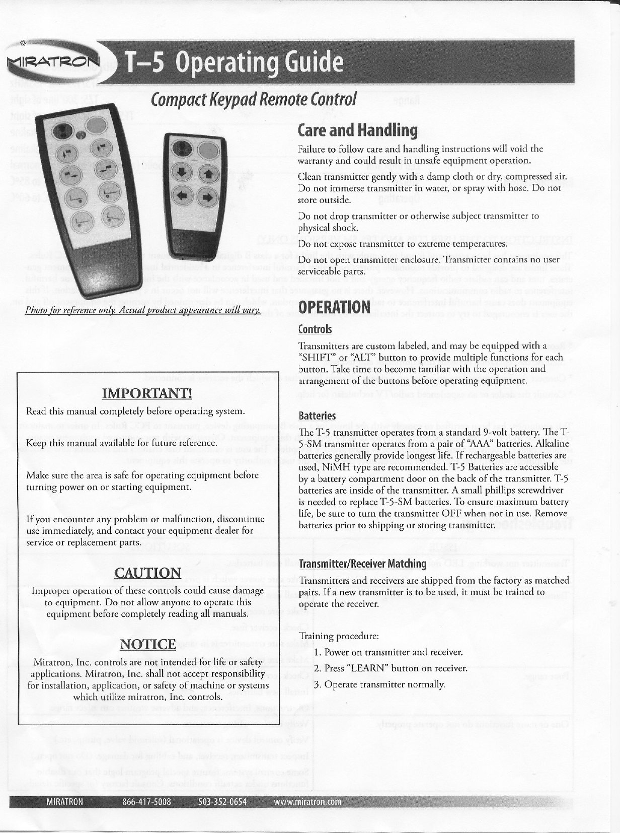 Miratron, Inc. Compact Keypad Remote Control Users Manual