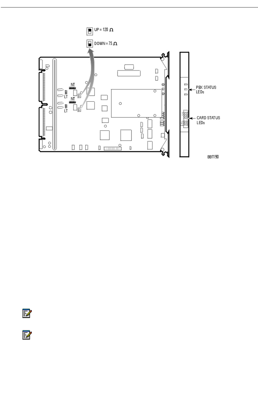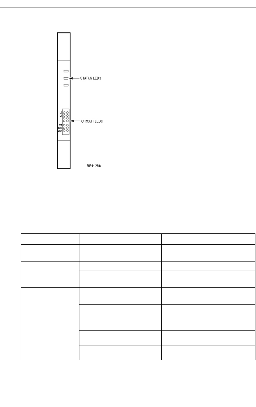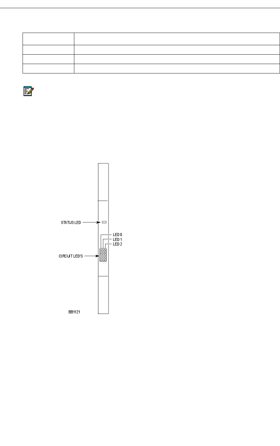 Three status LEDs and 4 circuit LEDs are mounted on the PRI card faceplate. Each of the card