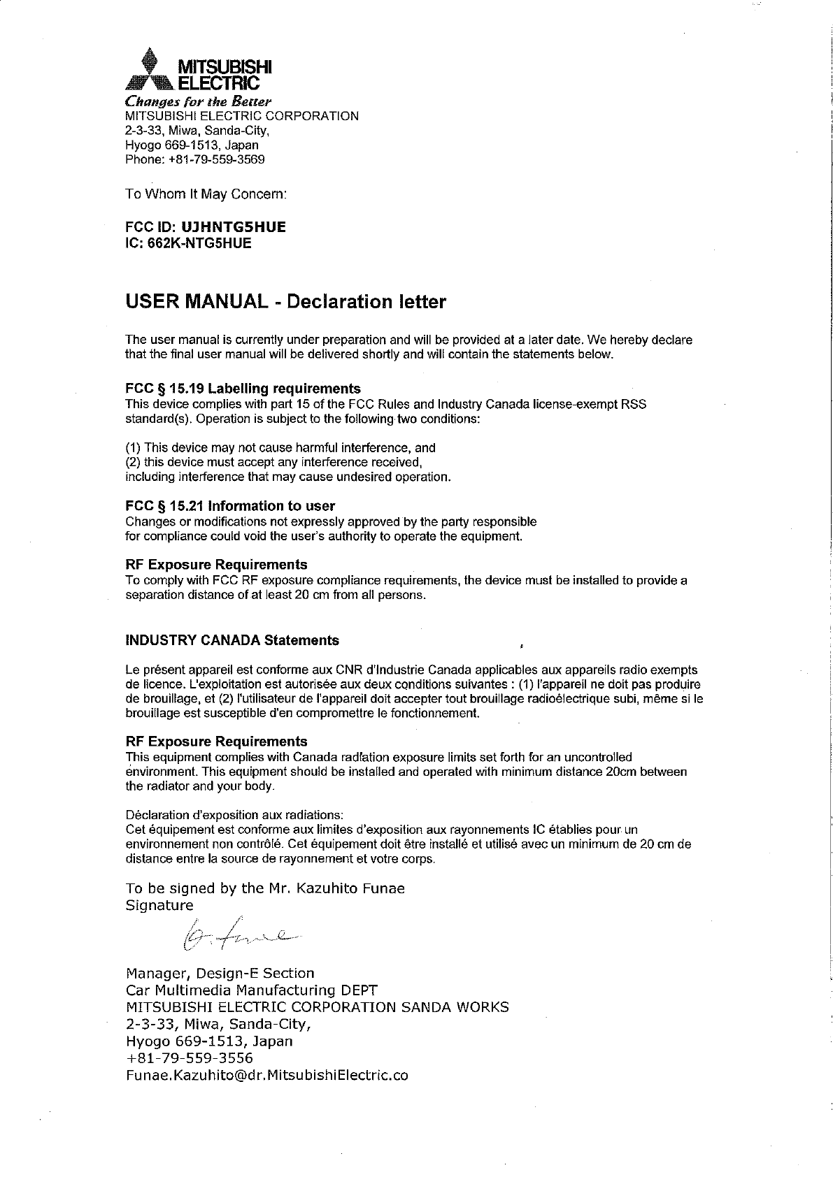 Mitsubishi Electric Sanda Works NTG5HUE Multimedia Car Radio with Bluetooth Transceiver User Manual Declaration