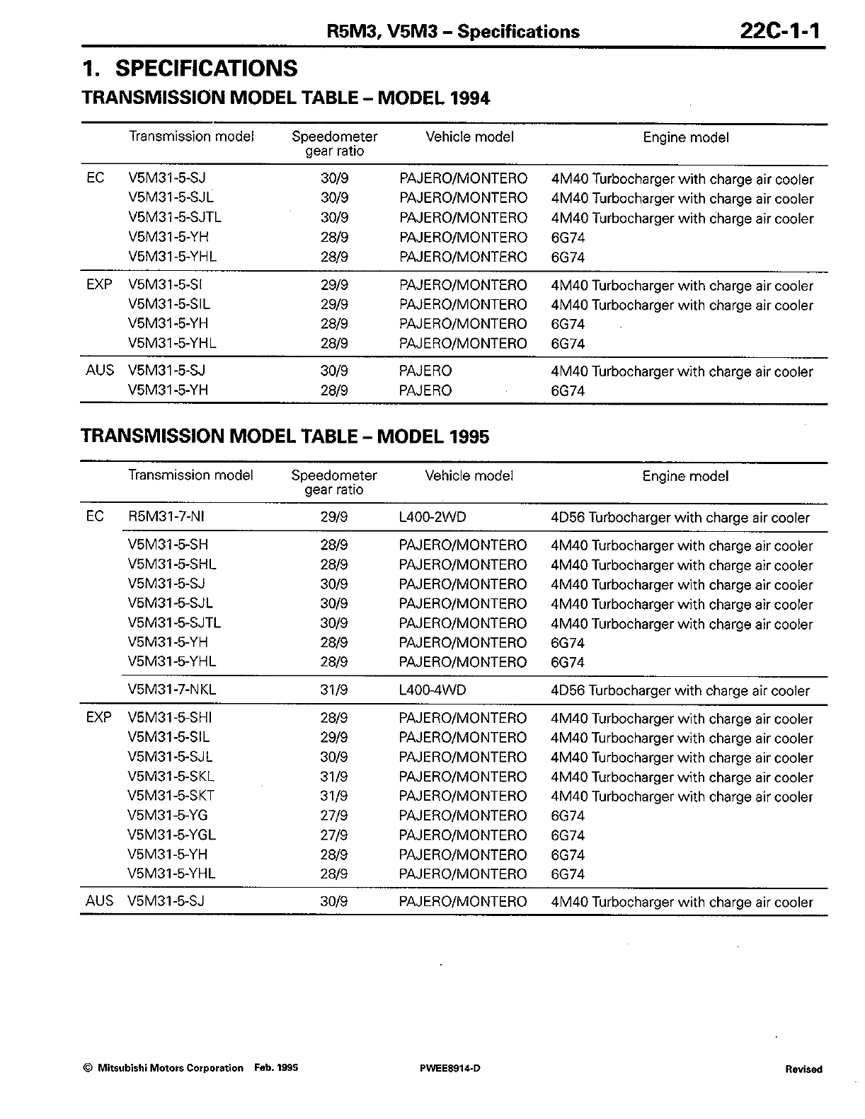 TRANSMISSION MODEL TABLE - MODEL 1996