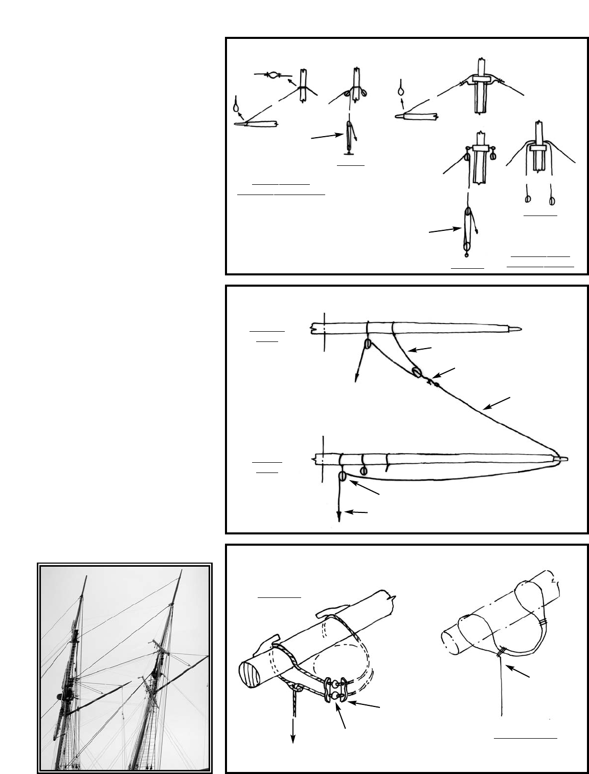 Details of masts and spars, block, rigging practices, and rigging sizes.