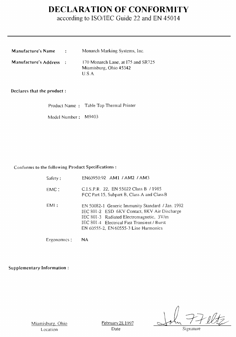 TC9403OH Rev. B 4/99 ©1997 Monarch Marking Systems, Inc. All rights reserved.