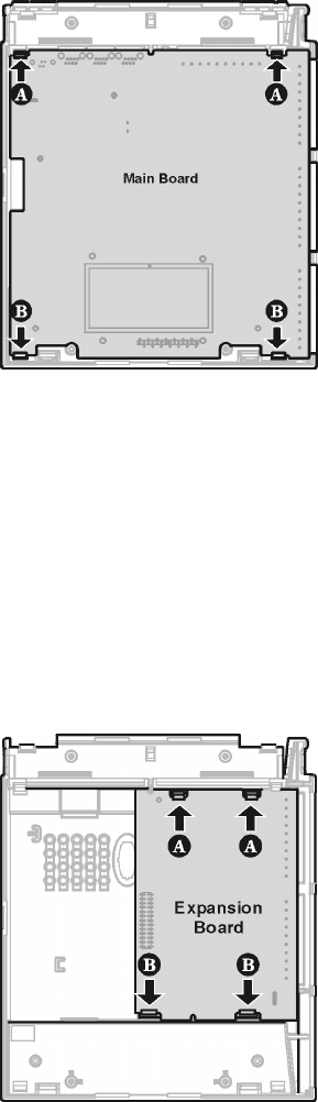 top of the Main board. Then press the two small tabs at the bottom of the Main board (B) to