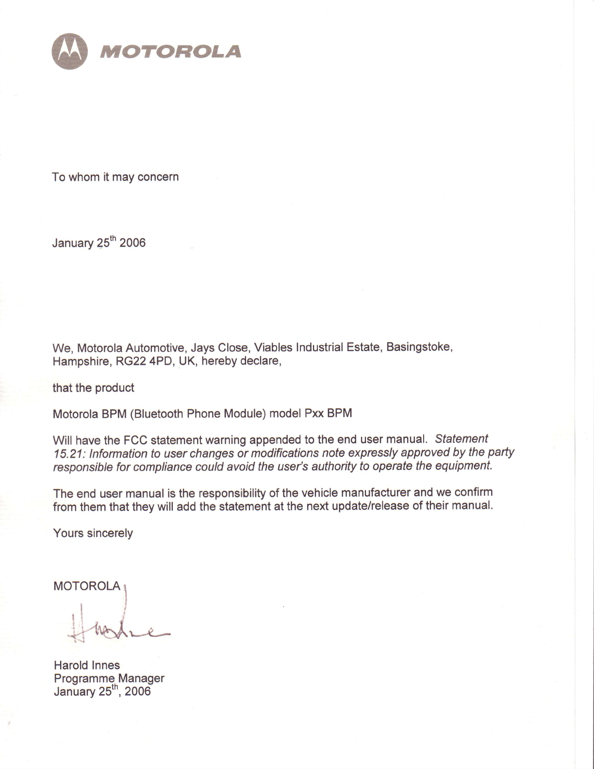 Motorola Solutions, Inc. Bluetooth Phone Module Users Manual