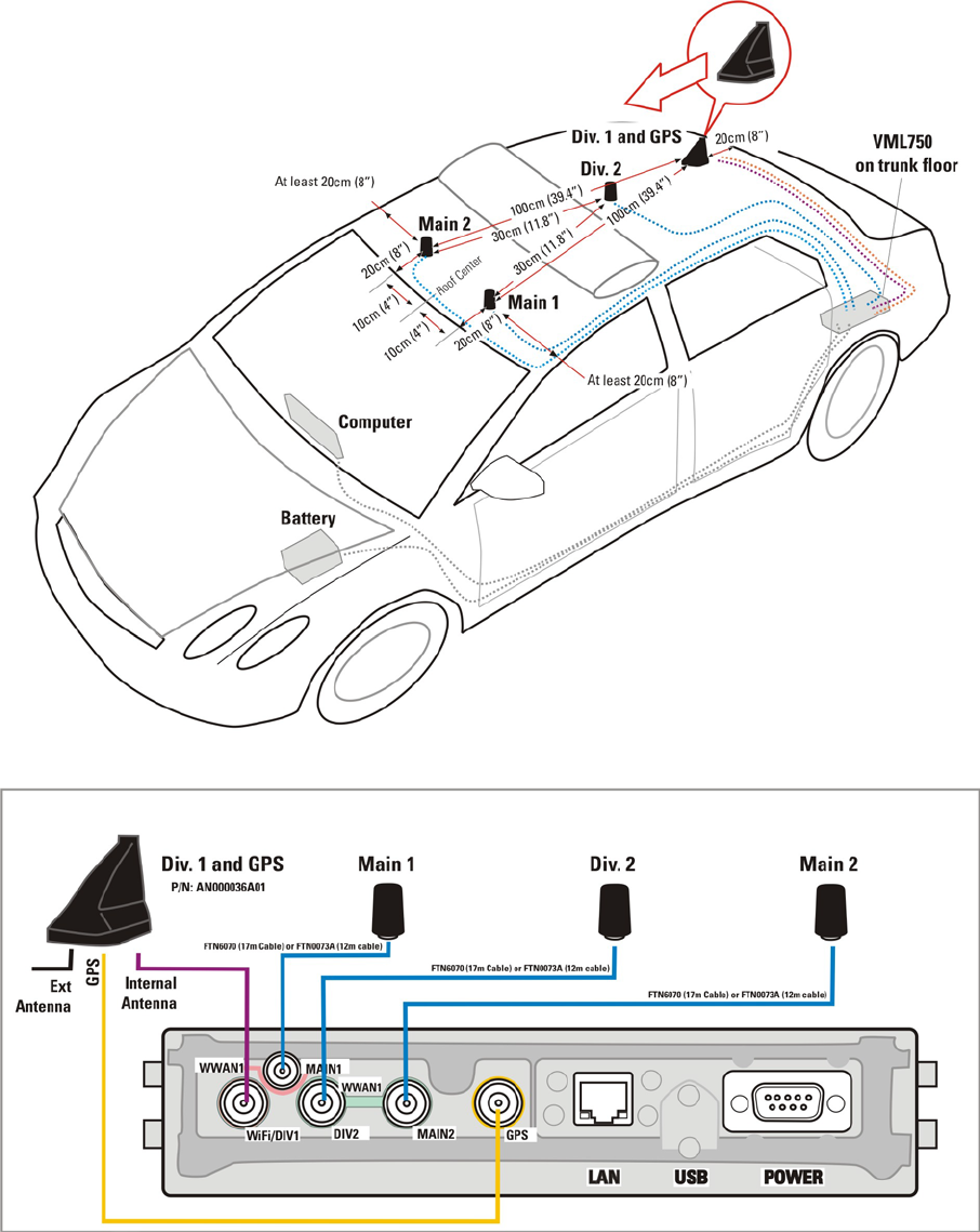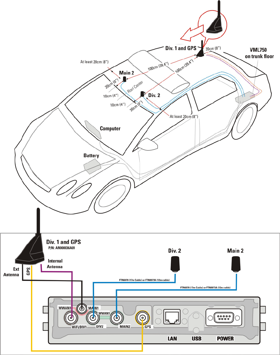 Keep a minimum separation of 39.4 in (100 cm) between the PSNB and BB LTE Antennas.