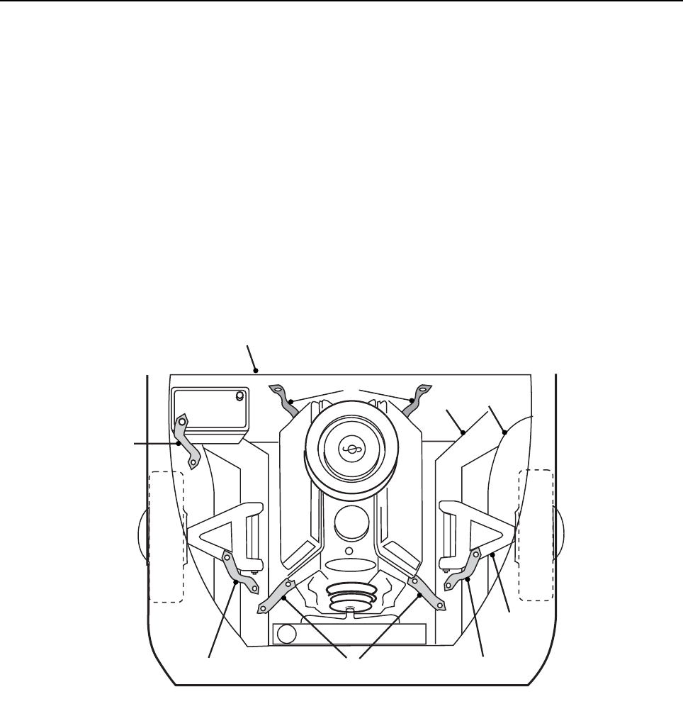 B. From engine block to vehicle frame at points where the engine is shock-mounted.
