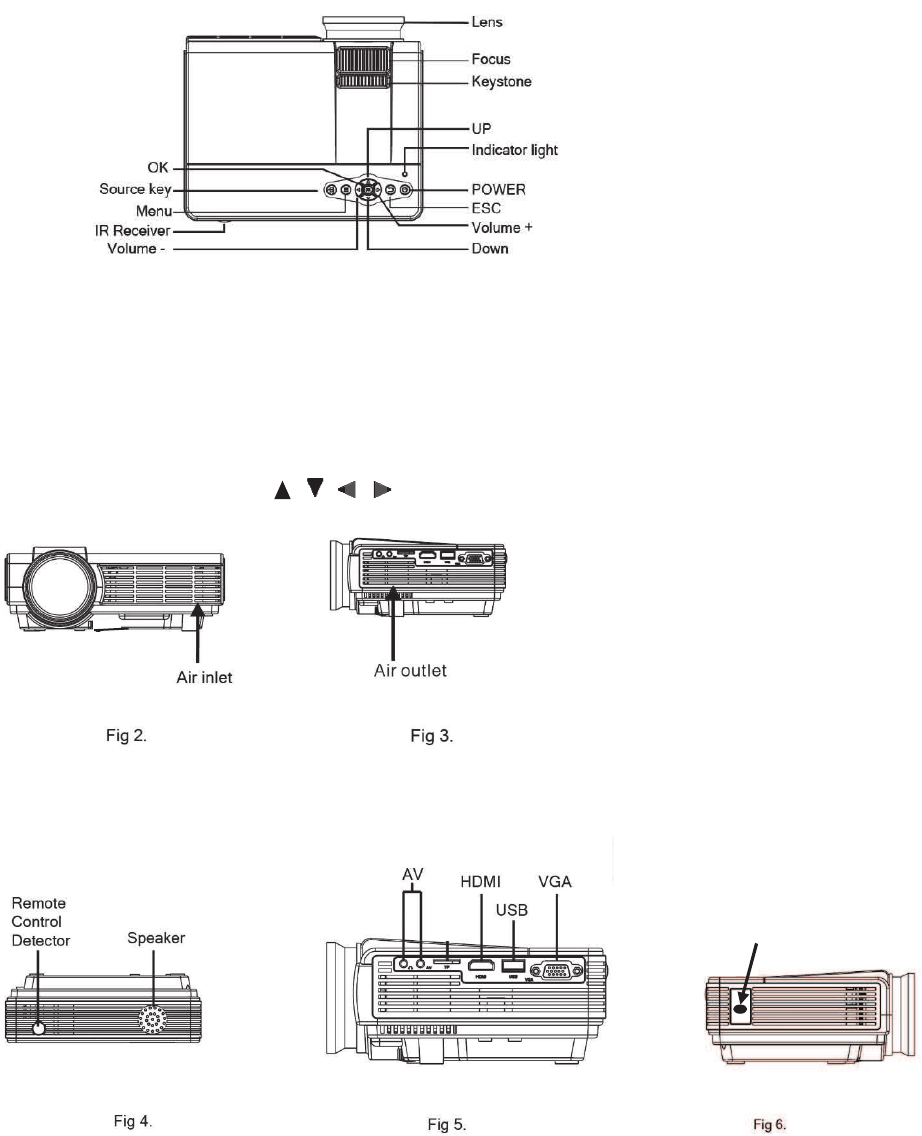 • Air Inlet and Outlet: Do not block. Ventilation is needed in order for the projector to not
