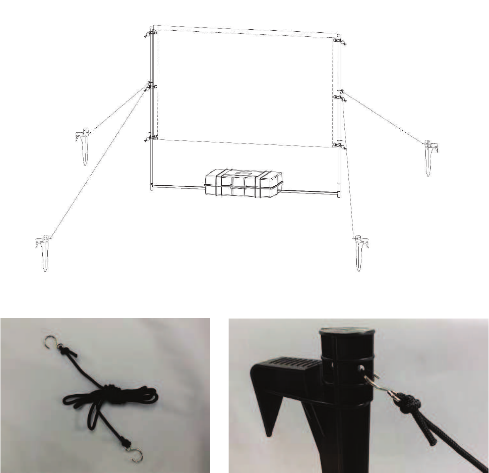 the holes furthest up the pole. Attach the hook at the other end of the string to the ground stake. Repeat