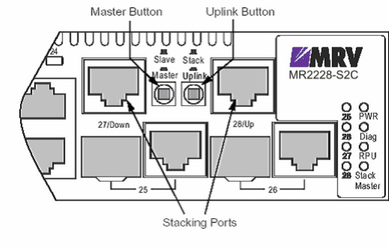 The MR2228-S2C switch is a stackable Fast Ethernet switch with 24