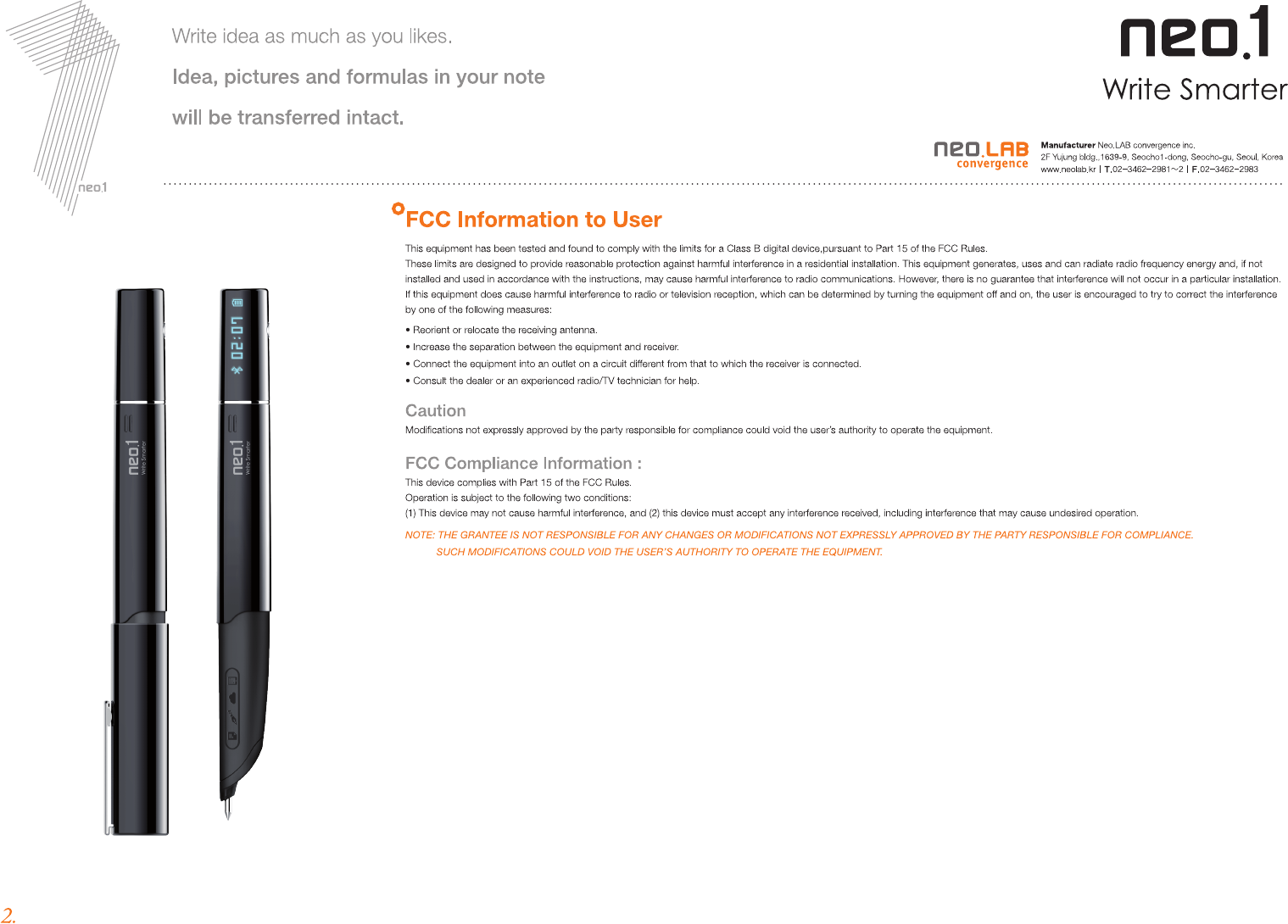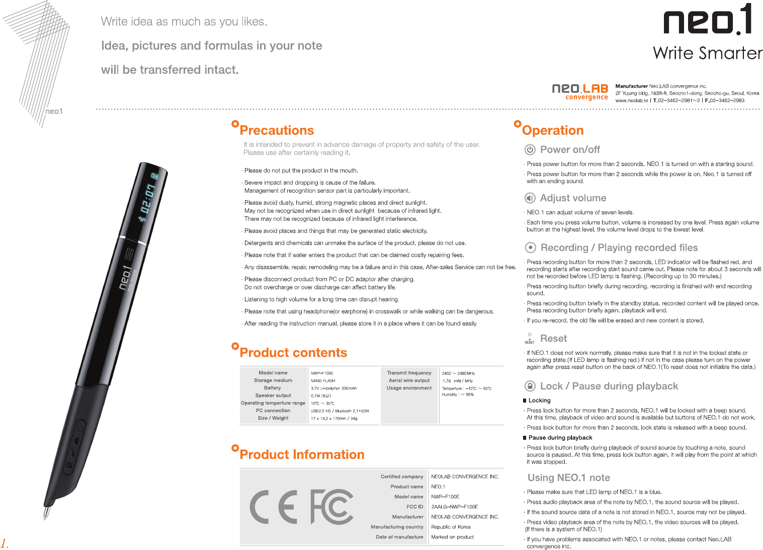 NEOLAB CONVERGENCE NWP-F100E BLUETOOTH PEN User Manual NEO1 manual draft 130718 Eng