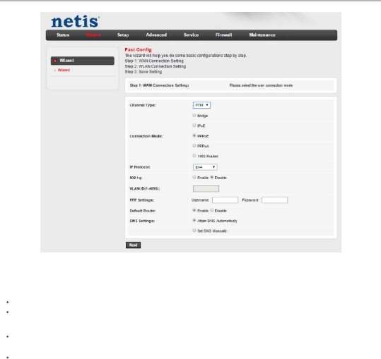 1) Step 1: WAN Connection Setting, please select Channel Type in advance. Select