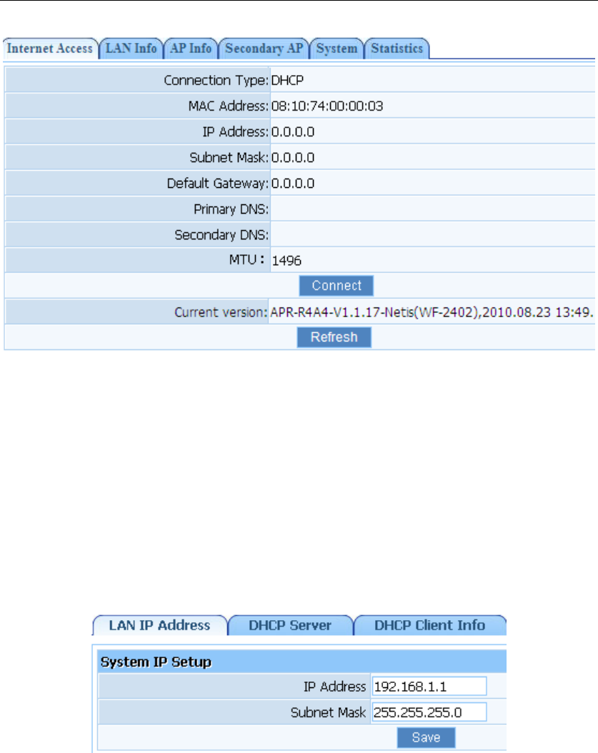 ¾ Select ‘LAN setup’- ‘LAN IP address’, change the IP address to something in line with R1.